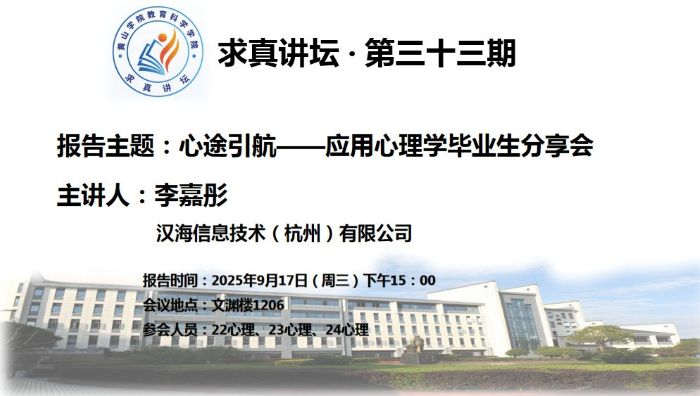 9月17日,汉海信息技术(杭州)有限公司的李嘉彤受邀为教育科学学院师生举办“心途引航”应用心理学专业毕业生分享会,22级、23级、24级心理学专业学生参与了此次活动。