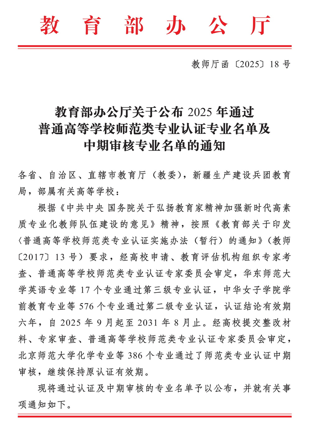 近日,教育部办公厅正式发布了《关于公布2025年通过普通高等学校师范类专业认证名单及中期审核专业名单的通知》。我校学前教育专业在该认证中顺利过关,认证结论有效期为六年。