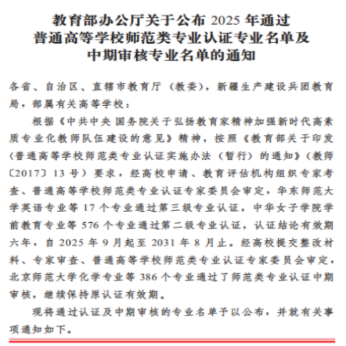 近日,教育部办公厅正式发布了《关于公布2025年通过普通高等学校师范类专业认证名单及中期审核专业名单的通知》。我校学前教育专业在该认证中顺利过关,认证结论有效期为六年。