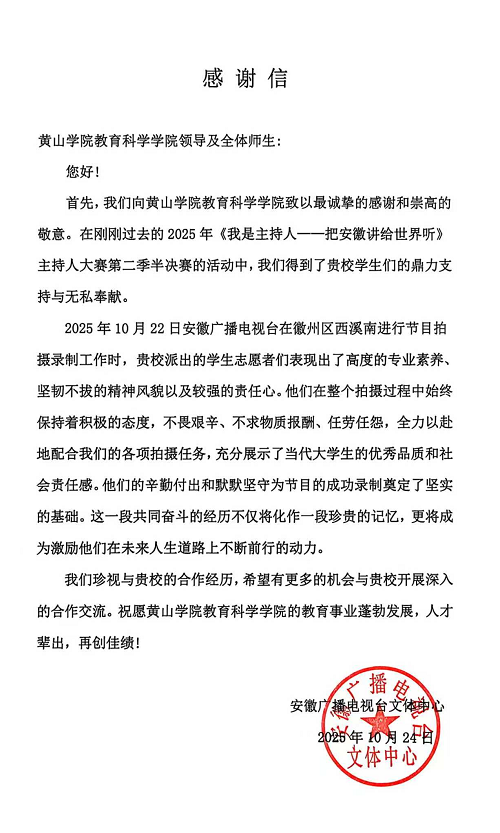 10月22日晚,安徽省文旅厅、安徽广播电视主办的《我是主持人——把安徽讲给世界听》主持人大赛第二季半决赛下半场在徽州区西溪南拉开帷幕。教育科学学院选派多名优秀学子参与了此次半决赛现场开场舞的节目录制,现场气氛热烈非凡,来自各地的优秀选手齐聚一堂,各展风采。