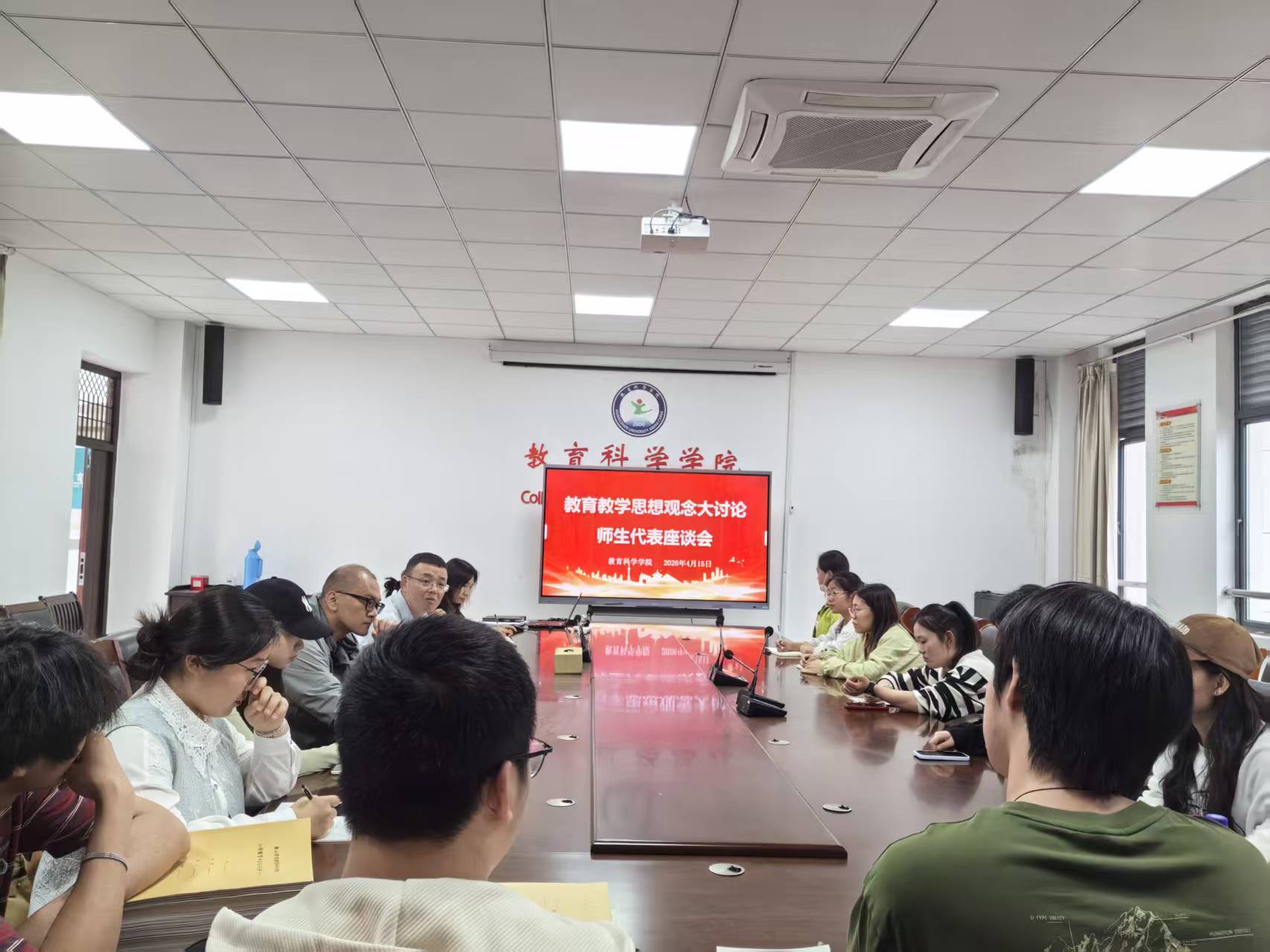 4月15日下午,教育科学学院于院会议室组织召开教育教学思想观念大讨论师生座谈会。学院党总支副书记赵国力主持会议,各教研室主任、实验实训中心主任及各班级学生代表共同参会。